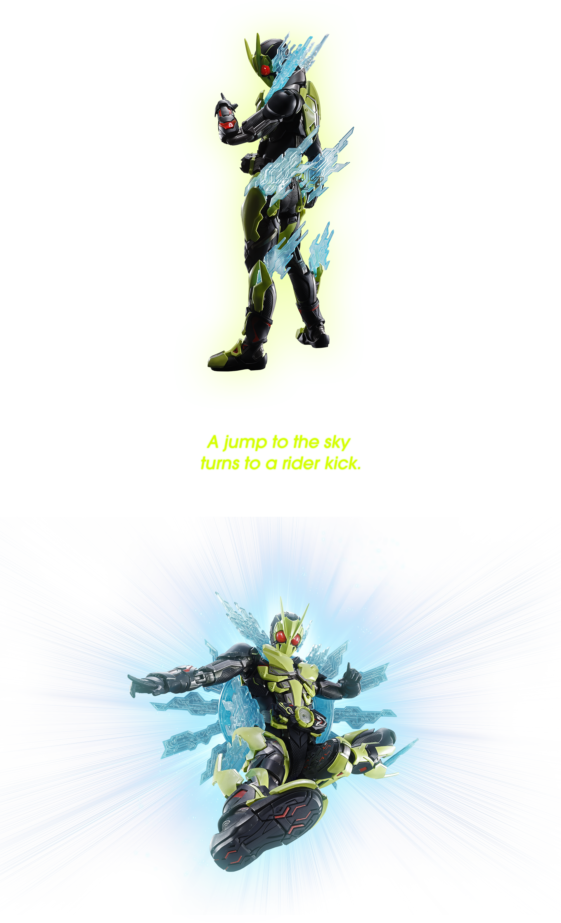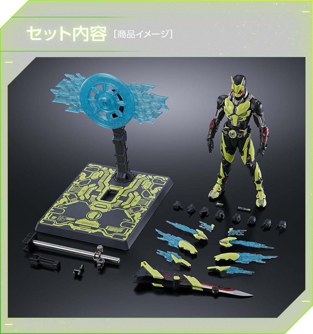 プロダクトデザイナー山下貴斗氏デザインアレンジ。ヒーローの体躯をベースに設計した新機構の数々。関節をはじめとした各所にダイキャストを使用。さらにメタリック彩色など素材面からも説得力を生み出す。劇中の演出を立体物に落とし込む豊富なエフェクトパーツが付属。新たに構築されたヒーローが夢に向かって今、飛び立つ。